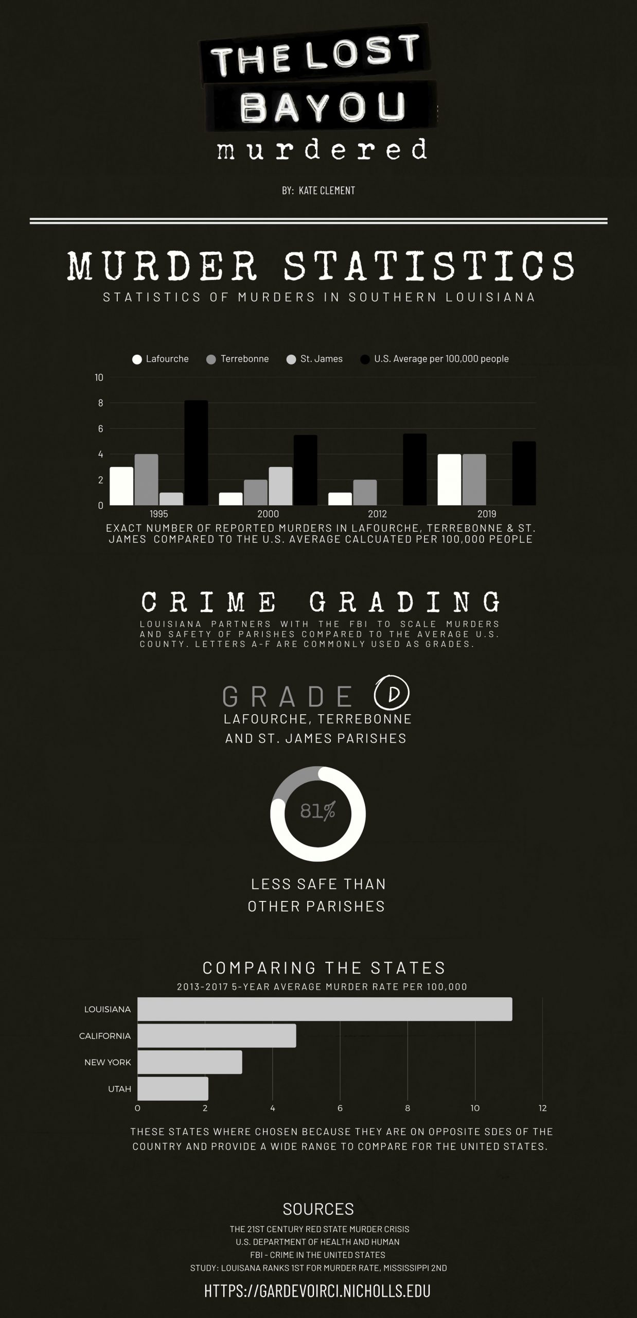 The FBI ranks parish safety on a letter scale from A to F. Lafourche, Terrebonne, and St. James parishes are 81% less safe than the U.S. average, earning a D rating.